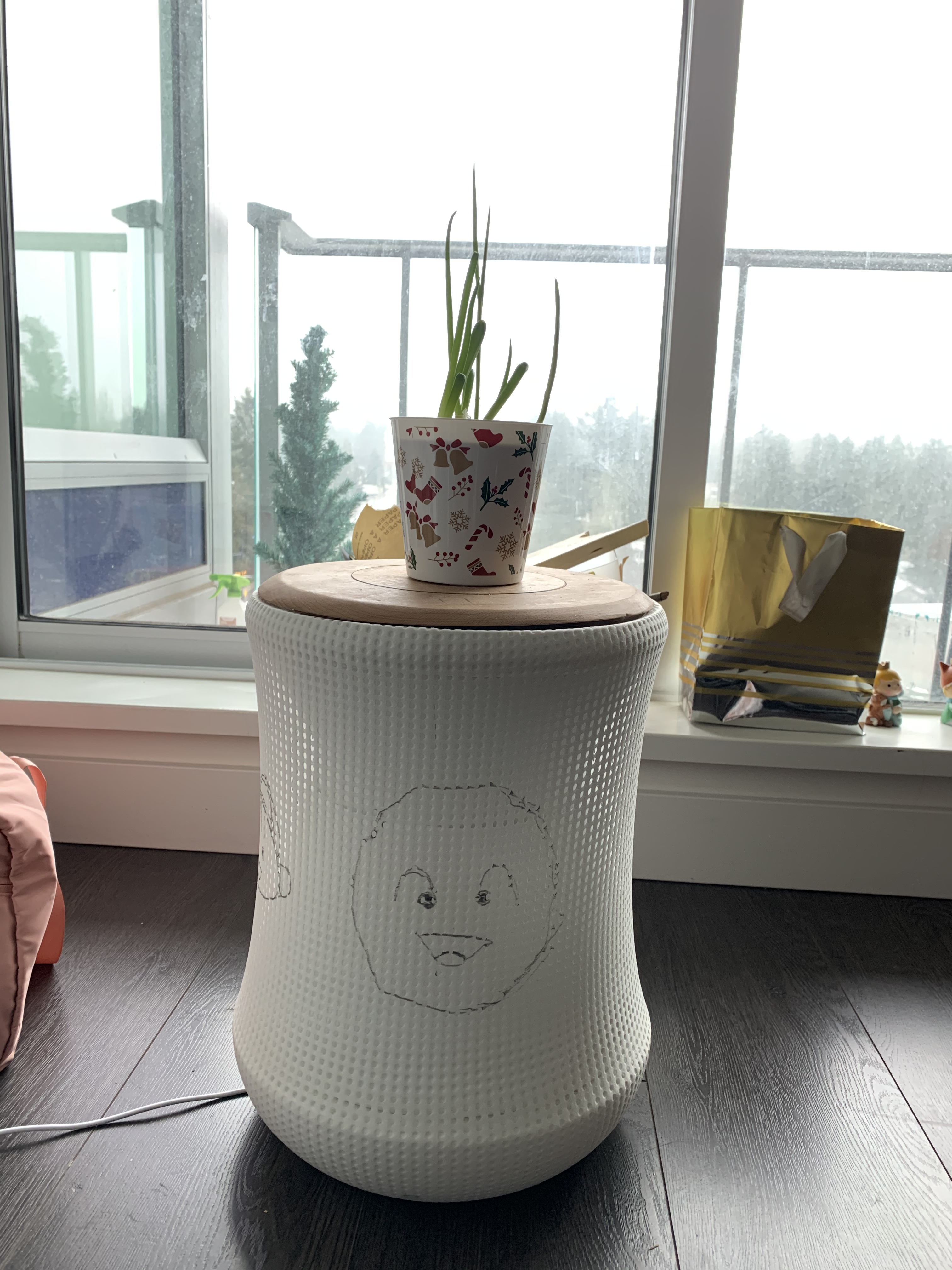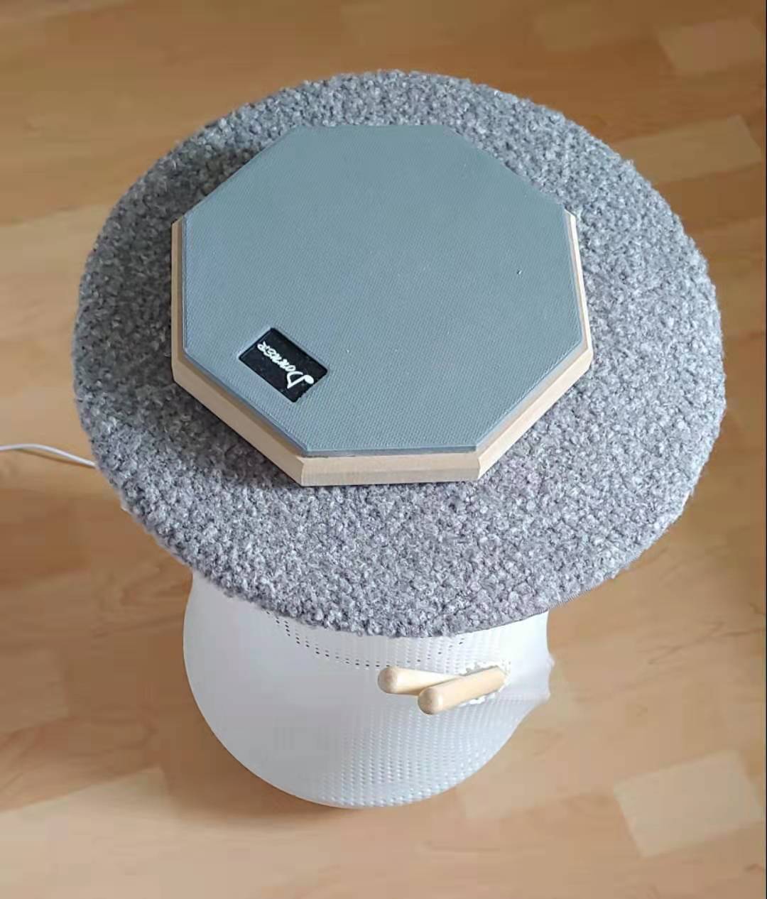 These works influenced our investigations of crafting shape-changing objects that support lived interactions and experiences. deformTable is a shape-changing device that rises up and down according to the weight of objects placed on its top surface. The input interface, so to speak, of deformTable, is its wooden top that can detect weights ranging from 20 grams to 5 kg. The output surface is an elastic fabric upholstered to the physical form of deformTable, which emphasizes how the dynamic shape changes in form. The fabric is white-coloured 4-way stretch spandex with hollowed dot patterns. The power supply of deformTable is an adapter with 12V and 2A DC output. The table would change shape in response to as little as 10 grams in weight to a maximum of 5 kilograms. The distance of vertical change is 10 centimetres.