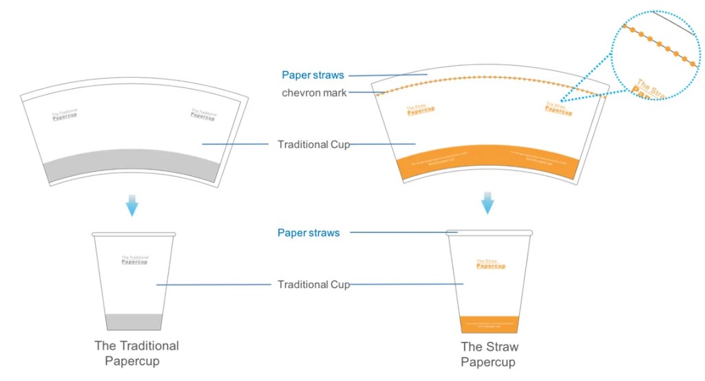 Disposable cups and straws have been widely used in fast-food restaurants and cafes. Although disposable paper cups are common, straw is still made of plastic, which is not environmentally friendly. In addition, straw needs to be taken specifically and separately from cups, which is inconvenient. To solve those two problems, the straw carried by the paper disposable cup is created. The structure of this cup is just as simple as adding the straw to the top of the original cup via a saw shape joint so that the straw can be easily torn down from the cup when it is needed.