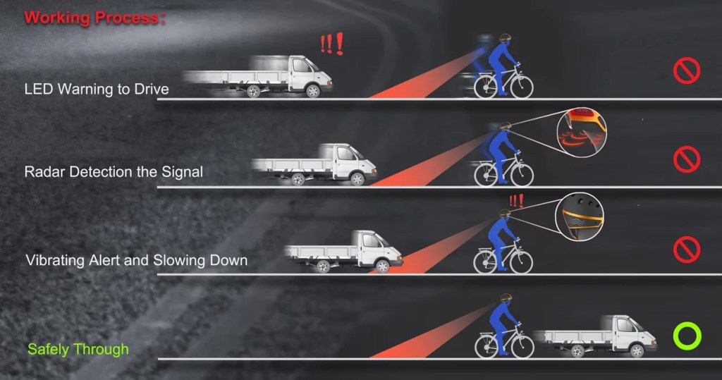 When the cars come near, the radar detector can deliver the messages to the deaf through the shock mount on the two sides of the helmets. It can remind the deaf of avoiding cars. It sets up the active safety relations between the drivers and the deaf.