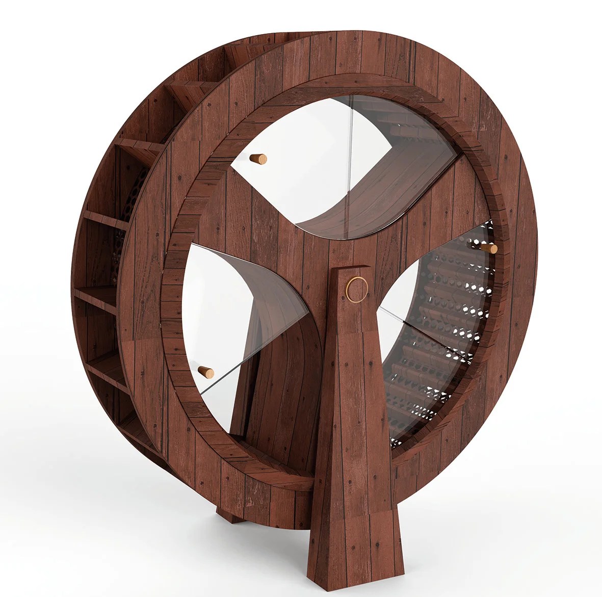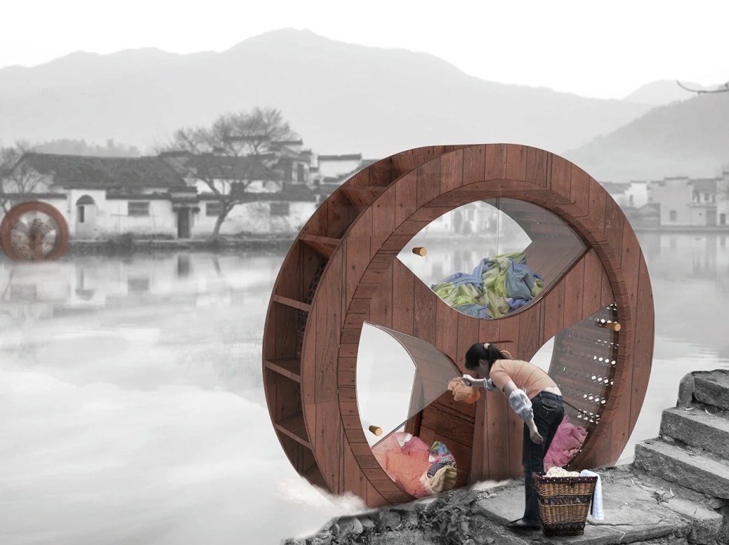 The periphery of the washing machine is inset with vanes, which are hit by the flowing river water and drive the machine. The body of the machine is divided into three separate ‘cabins’, which allow three families or individuals do their laundry at the same time. Within each cabin, triangular ridges of timber assist with agitating the garments.